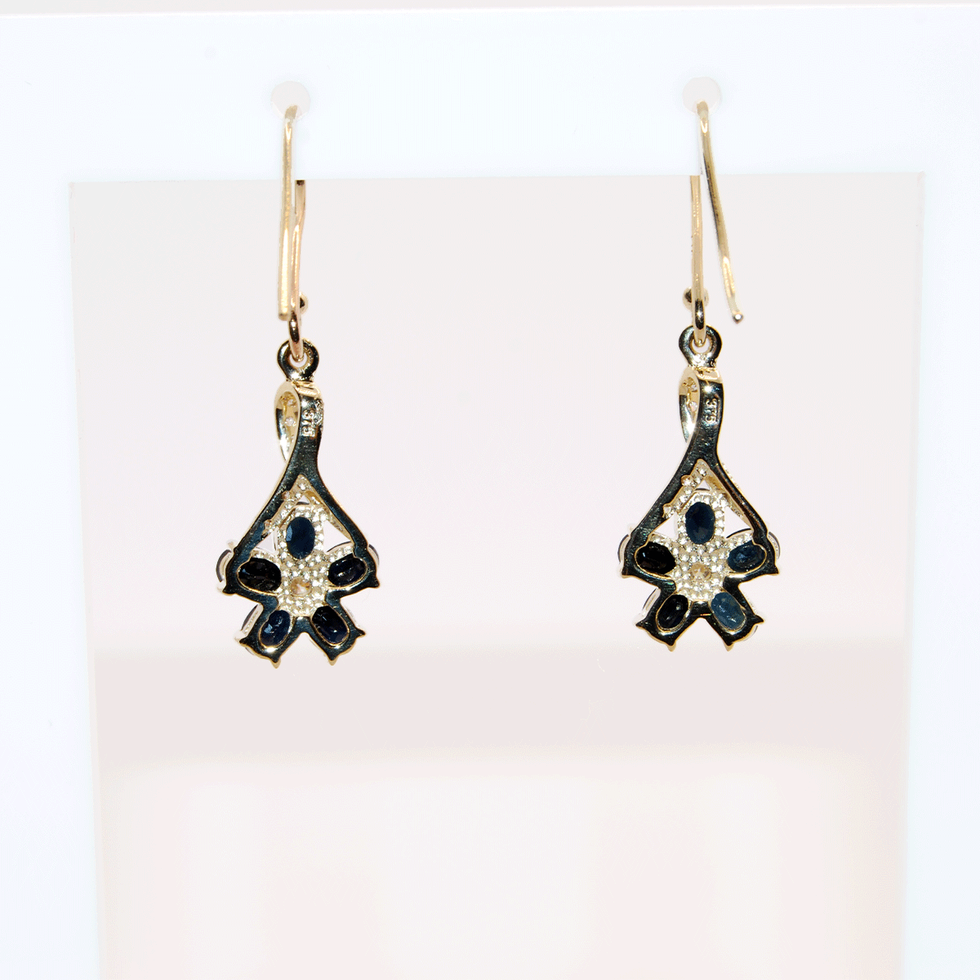 9ct Yellow Gold Oval Black Sapphire and Round Diamond Flower claw set drop hook earrings
